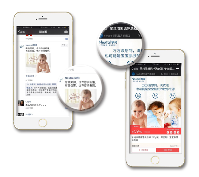 从两种体验渠道制定不同的互动创意,与数据包进行匹配。微信有赞商城实现泛人群挚纯洗衣液小团创意,QQfeeds流+微店实现细分人群实现挚纯洗衣液大团、小团、赠品三条创意